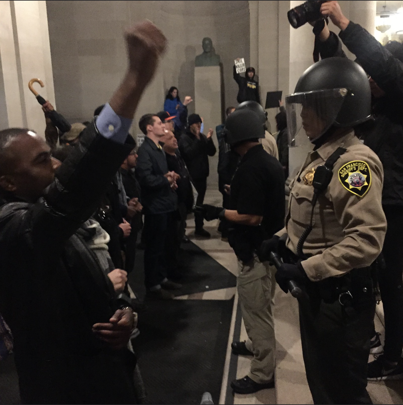 As the Frisco Five were hospitalized after two weeks without solid food, hundreds of their supporters, dubbed the #Frisco500, occupied the rotunda and grand staircase inside City Hall for seven hours on May 6, holding their ground past the building's 8 o'clock closing time, chanting that they would not leave until Mayor Lee fired Chief Suhr. Baton-wielding sheriff's deputies in full riot gear met the crowd at the doors; protesters pushed through, banged on the Mayor's office door, and were ultimately dragged out in a eight-hour struggle that left 33 people arrested, including juveniles, and journalists being shoved and manhandled.