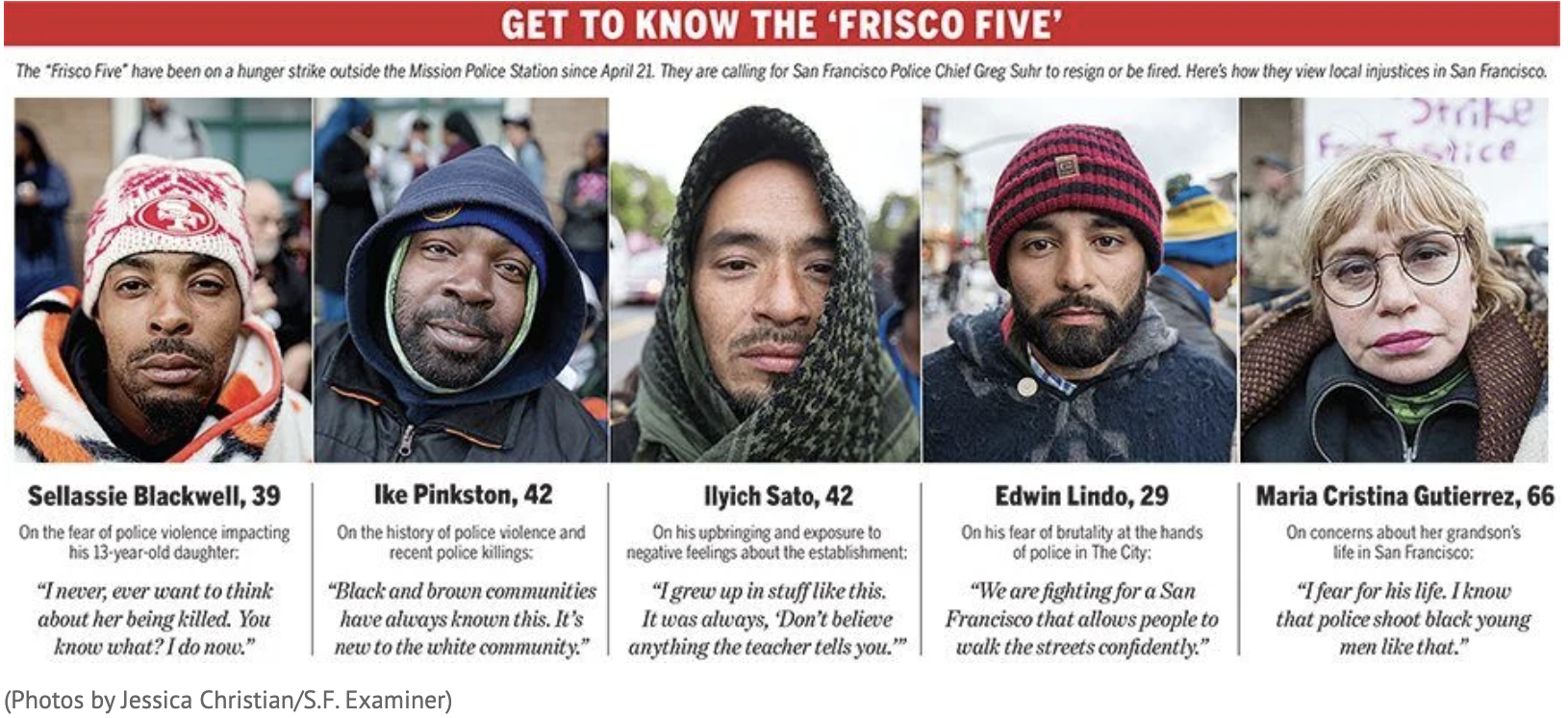 In April 2016, five San Francisco activists, Ike Pinkston, Ilyich Sato, Sellassie Blackwell, Maria Cristina Gutierrez, and Edwin Lindo, went on a hunger strike outside San Francisco Police Department headquarters, demanding the resignation of Police Chief Greg Suhr following a string of police killings of Black and Latino San Franciscans.